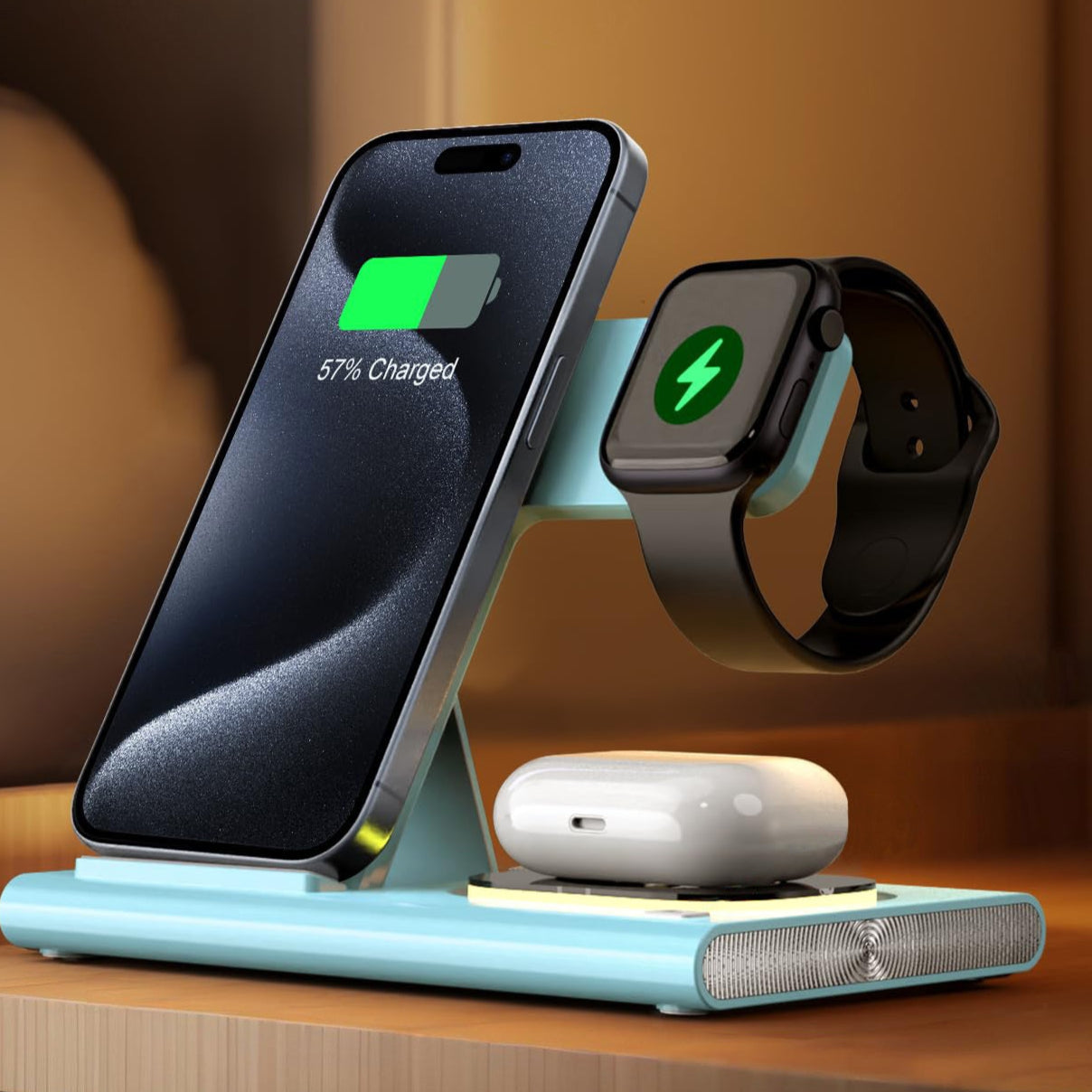 - [Upgraded 4 in 1 iPhone Wireless Charger] iPhone,iPods,iWatch charging and night light 4 in 1 fasting charging wireless charger station. This foldable iPhone charging station charge wirelessly for iPhone[NOT MAGNETIC],iWatch,Air Pods. For iPhone 15/15 Pro/15 Pro Max/15 Plus,iPhone 14/14 Pro/14 Pro Max/14 Plus,iPhone 13/13 Pro/13 ProMax/iPhone 12/12 Pro/12 Pro Max/SE/XR/X/XS/XS Max/11 Pro Max/11 Pro/11/8 Plus/8[Wireless NOT Magnetic];Apple Watch Ultra 2/Ultra Series 9/8/7/6/5/4/3/2/SE/SE2,Air Pods Pro 2/Pro,Air pods 3/2(Wireless Charging Case), and other Phones and Earpbuds which support wireless charging .